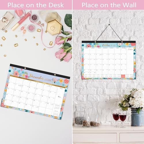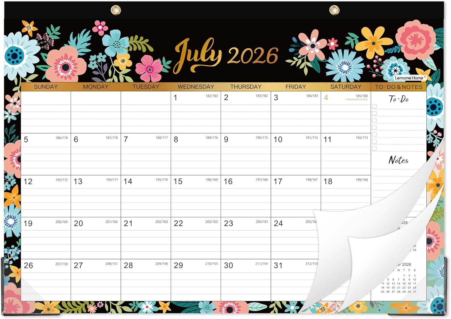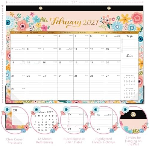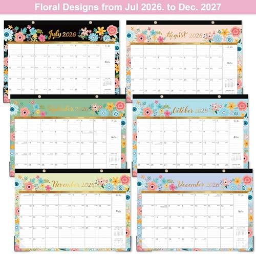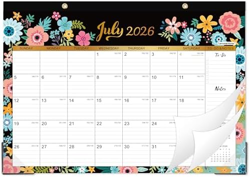 Stay organized and stylish with our Calendar 2026-2027! This 18-month desk and wall calendar covers July 2026 to December 2027, providing ample space for all your important dates and appointments. Measuring 16.8″ x 12″, it features ruled blocks for easy writing and planning. The elegant black floral design adds a touch of sophistication to any workspace or home office. With durable corner protectors, this calendar is built to last throughout the year. Perfect for students, professionals, or anyone looking to enhance their time management skills. Make every day count with our Calendar 2026-2027!